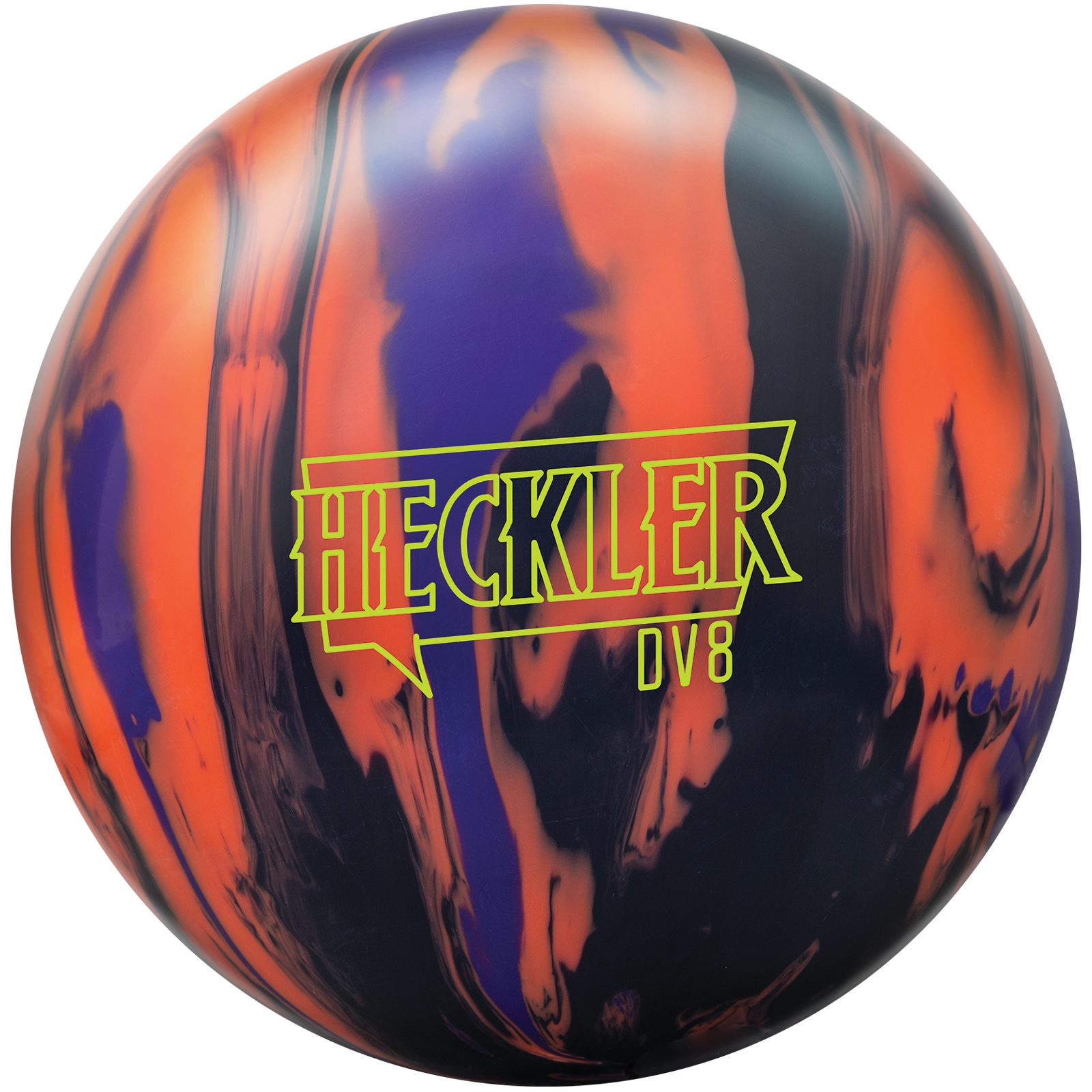 The DV8 Heckler is a high-performance asymmetric bowling ball, featuring the new Unholy Core designed for two-handed/no-thumb bowlers but effective for all styles, using an aggressive HK22C Maximum Havoc coverstock to provide strong midlane traction and a powerful backend reaction on medium to heavy oil patterns, offering great control and hitting power with options like solid and hybrid versions.
