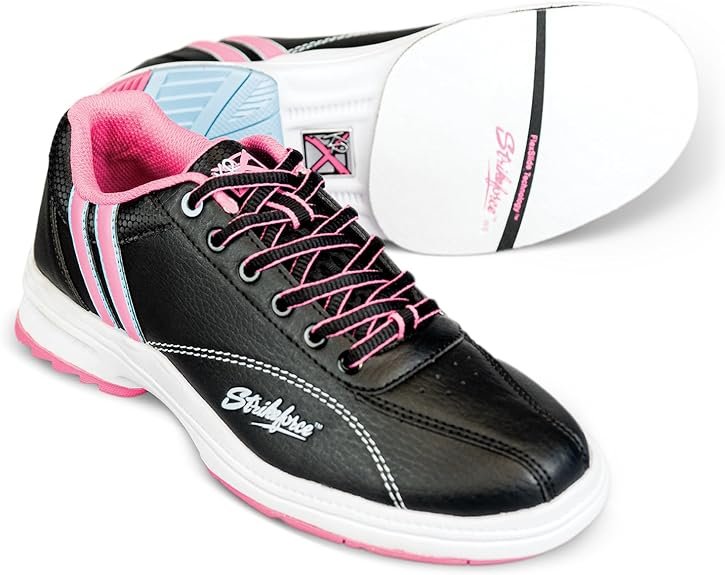 Strikeforce KR Starr Blk/Pnk/Blu Ladies RH bowling shoes offer a performance fit with interchangeable slide and non-slide soles, built for female right-handed bowlers who want reliable control and smooth approaches.
